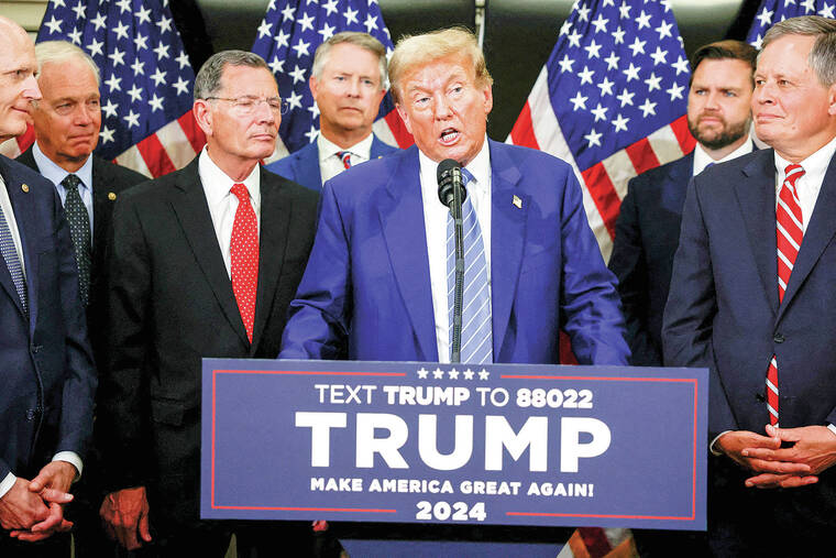 WASHINGTON — Donald Trump criticized U.S. aid to Ukraine and suggested raising tariffs to replace the U.S. income tax on a Thursday visit to Capitol Hill where he also called the city hosting his party’s presidential convention “horrible.”