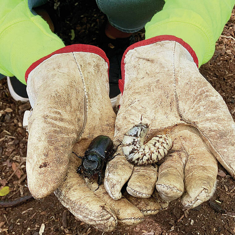 This large horny beetle has now been found on Hawaii Island and can easily be spread by humans. For example, green waste containing the larvae or adults is often composted and used as mulch by local gardeners. At this point, we have to be careful to inspect mulch, compost and any palms we transport. The beetle can also attack sugar cane and Pandanus or Hala species. The beetle is about two inches in size. The larvae can be up to four inches long before pupating. When they first attack the bud of a palm, the new leaves emerge damaged. If you think you have found affected palms, beetles or larvae go to crbhawaii.org to report the sighting and for further information.