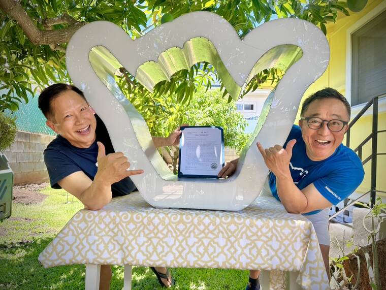 Photo credit ID8 — Steve Sue (left) and Honolulu Sen. Glenn Wakai throw the shaka, the first state gesture in the U.S.