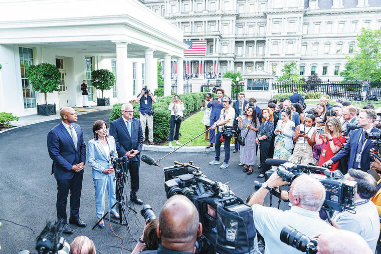 After the meeting, a handful of governors spoke with reporters outside the White House, with one, Gov. Kathy Hochul of New York, declaring, “President Joe Biden is in it to win it, and all of us said we pledged our support to him.”