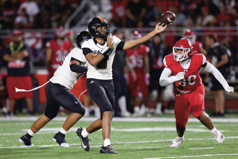 Sagapolutele joins Kapolei’s Liatama Amisone (San Jose State) and Mililani’s Kini McMillan (Washington) as seniors who have announced commitments to FBS schools. Assuming they all follow through and sign in December, it will be the first time three quarterbacks from the same high school class in the state of Hawaii will sign with FBS schools.