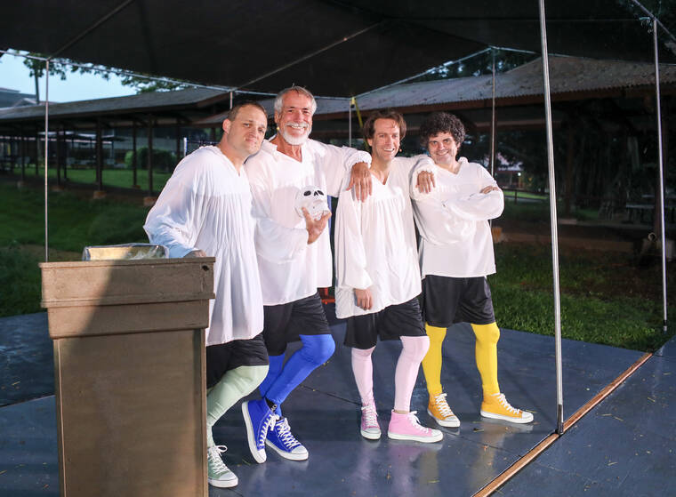 Photos: Kelsey Walling/Tribune-Herald From left, Sean Douglas, Saul Rollason, Wilfred Gee and Theon Weber pose for a photo Tuesday during rehearsal for "The Complete Works of William Shakespeare (abridged)" outside the UH-Hilo Performing Arts Center.