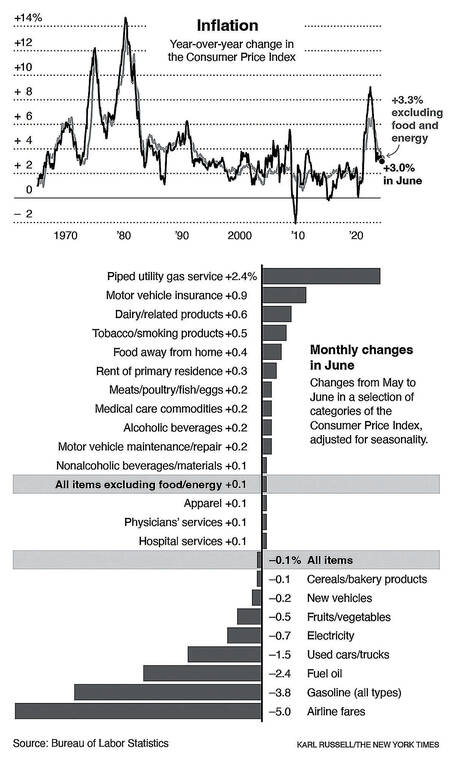 The consumer price index climbed at a moderate pace in June compared with a year earlier and fell on a monthly basis, welcome news for Federal Reserve officials who are watching for further evidence that they have wrestled rapid inflation under control.