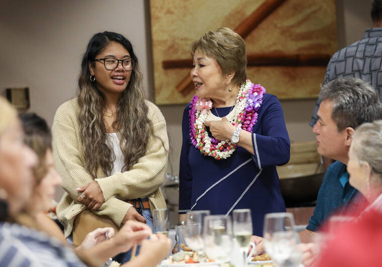Kelsey Walling/Tribune-Herald State Sen. Lorraine Inouye talks with her new committee clerk, Netty Leviticus, while introducing her to supporters during her Primary Election party at the Hilo Hawaiian Hotel on Saturday.