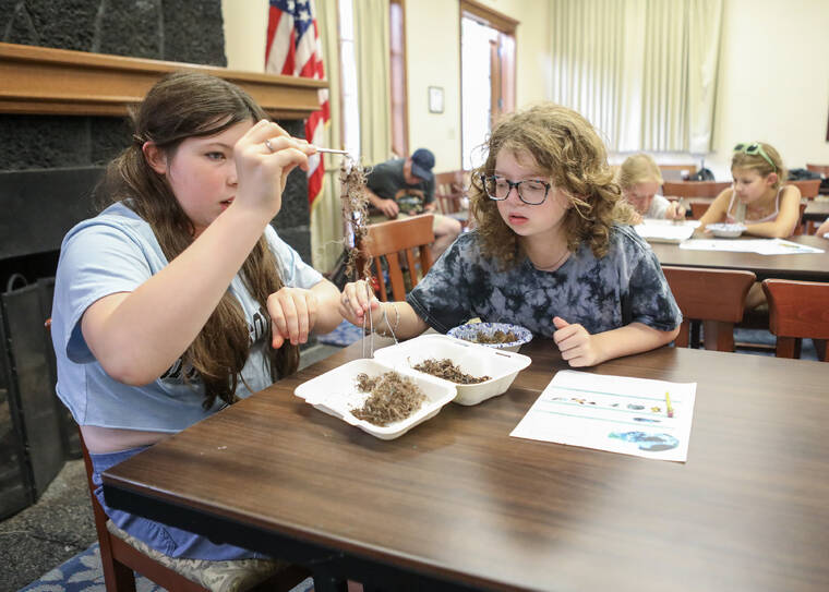 Kelsey Walling/Tribune-Herald Vivian, left, and Sammy look at the contents from the digestive system of an albatross while dissecting a bolus last month as part of a summer camp led by the ISLE Project.
