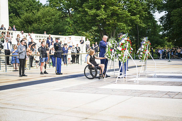 DETROIT — Former President Donald Trump wrapped himself in military imagery on Monday, attacking the Biden administration over its withdrawal from Afghanistan. Observing the third anniversary of a deadly suicide bombing in Kabul, the Afghan capital, he visited Arlington National Cemetery, then later spoke in Detroit to a gathering of National Guard members.