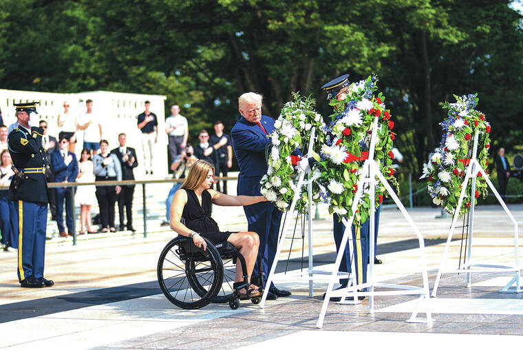 Trump had laid three wreaths at the Tomb of the Unknowns on Monday morning, the third anniversary of the Abbey Gate bombing. Two of the wreaths were for Marines killed: Hoover and Sgt. Nicole Gee. A third was dedicated to all 13 troops killed.