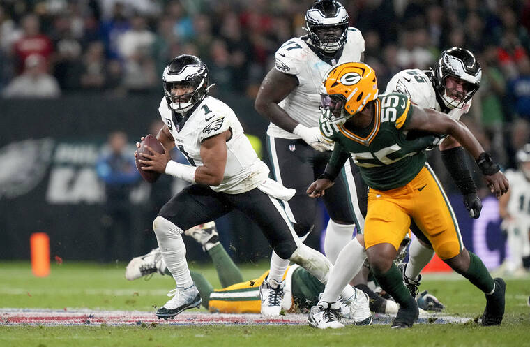 Barkley rushed for 109 yards and two scores and added a touchdown catch in the first NFL game ever played in South America. Jalen Hurts completed 20 of 34 passes for 278 yards, two touchdowns and two interceptions, and A.J. Brown had five catches for 119 yards and one TD.