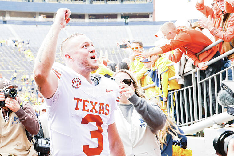 ANN ARBOR, Mich. — Before the question was finished, Steve Sarkisian assigned the media some quick homework. Texas quarterback Quinn Ewers has won starts at Alabama and now at Michigan over the past two seasons, after Saturday’s 31-12 statement win.