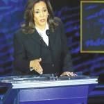 “It’s time to turn the page,” Harris declared in an aggressive performance that seemed to draw on her career as a courtroom prosecutor.