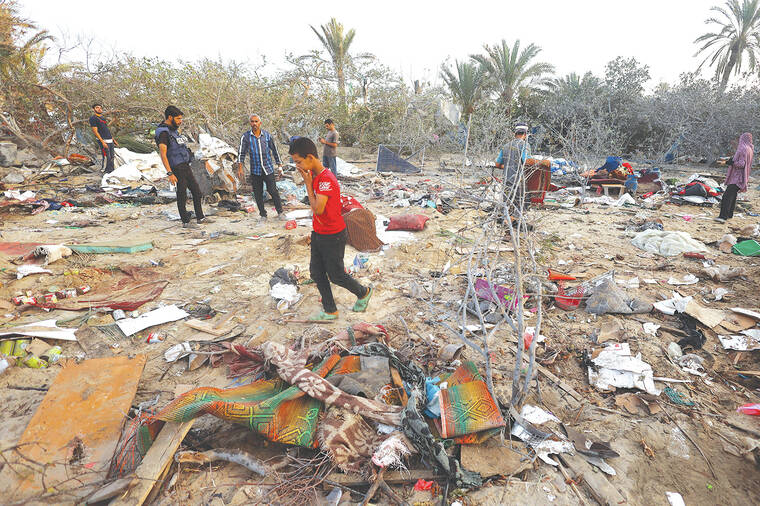 AL-MAWASI, Gaza Strip/CAIRO — Israeli strikes blasted a huge crater in a designated safe zone in southern Gaza before dawn on Tuesday, setting tents ablaze and burying Palestinian families under sand.