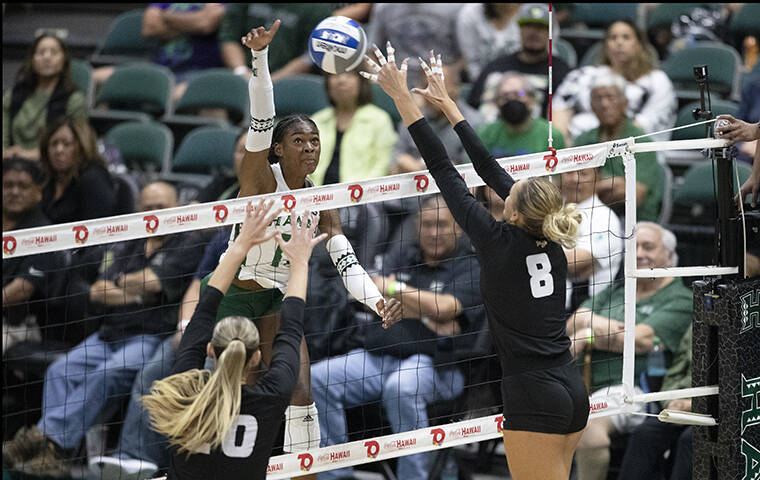 The Rainbow Wahine closed out the final four points, with Stella Adeyemi’s seventh kill booming off a Bobcats defender and into the crowd for the win.