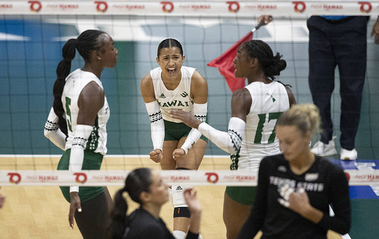 Caylen Alexander put down a match-high 20 kills and Hawaii middle blockers Jacyn Bamis and Miliana Sylvester each had 10 kills to help the Rainbow Wahine put away Texas State 25-17, 15-25, 25-19, 25-18 on a rare Tuesday night match at SimpliFi Arena at Stan Sheriff Center.
