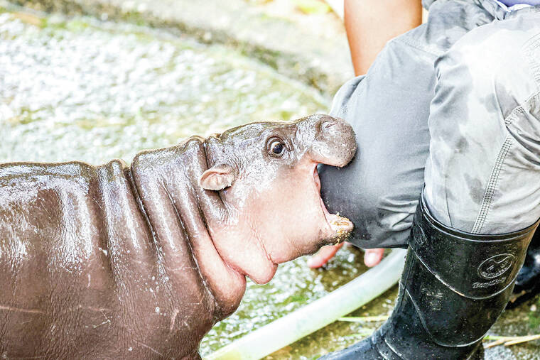 On Monday morning, the pink-cheeked hippo, whose siblings are called Pork Stew and Sweet Pork, was sitting happily in a bowl of vegetables and other snacks.