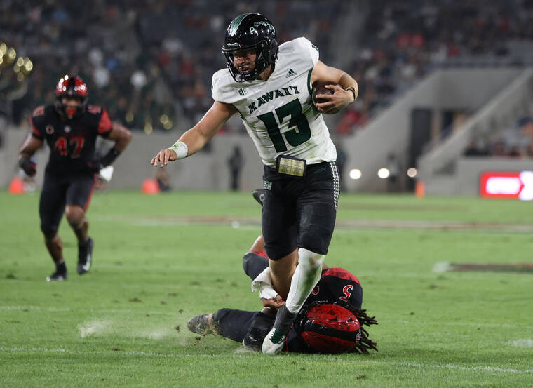“He’s one of the toughest quarterbacks I’ve been around,” said head coach Timmy Chang, a record-setting passer for the Rainbow Warriors in the 2000s. “People come at him. Sometimes I’m amazed he’s able to go the next week. But he does. It’s his mental toughness.”