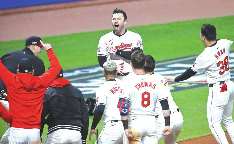 CLEVELAND — David Fry delivered a walk-off two-run homer in the 10th inning after Jhonkensy Noel hit a game-tying two-run blast with two outs in the ninth as the Cleveland Guardians pulled out an improbable 7-5 victory over the visiting New York Yankees on Thursday in Game 3 of the American League Championship Series.