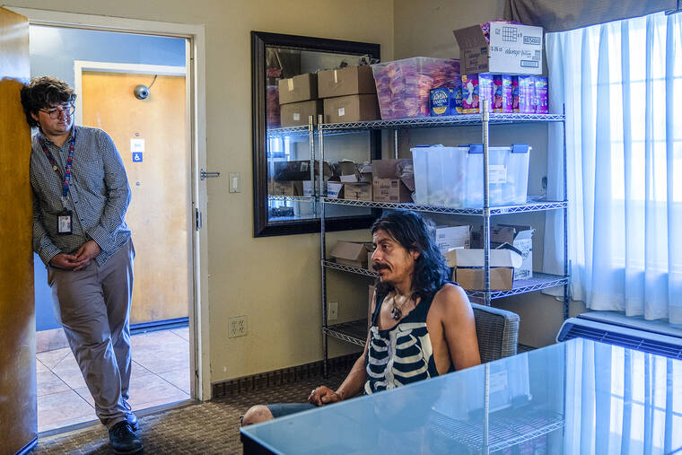 In a motel room that had been converted into an office, Bauer tinkered with an enormous spreadsheet that tracks whether each resident has been verified as homeless by the government, whether they have identification documents, whether they have disability benefits and where they are in the search for a permanent home. Case workers typically have more than 20 clients each.