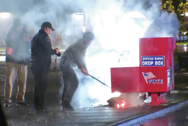 Earlier on Monday morning, police responded to a similar incident at a ballot box in Portland, Oregon, just across the Columbia River, caused by an incendiary device. Multnomah County’s election director said only three ballots were damaged in that fire, and that those voters will be contacted to fill out replacement ballots.