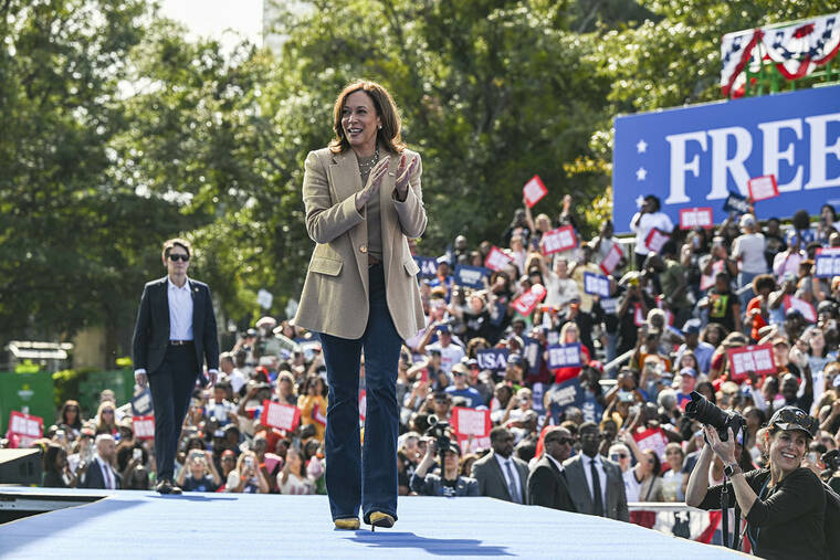 Vice President Kamala Harris takes the stage for a campaign rally in Atlanta on Saturday, Nov. 2, 2024. Harris and former President Donald J. Trump swept through Southern battleground states on Saturday, outlining sharply divergent economic messages for voters in areas where the presidential race remains in a dead heat. (Kenny Holston/The New York Times)