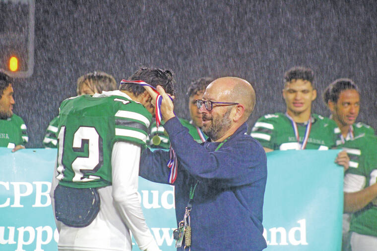 Central Pacific Bank awards Kona defensive back Trent Wong Yuen with a championship medal after the Wildcats blanked the Cougars 36-0 in Saturday's CPB/BIIF Division I Football Championship against Kea‘au at Julian R. Yates Field. (Conor Langs/West Hawaii Today)