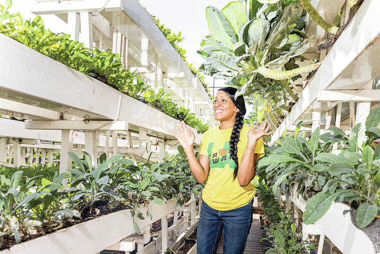 Tangles of grapes and blackberries grow in clusters along a trellis. Leafy rows of basil, sweet potatoes and mesclun spring from raised garden troughs. Most striking are corridors of elevated planters stacked four high, like multilevel bunk beds, filled with kale, cabbage, arugula, various lettuces, eggplants, tatsoi and collard greens.