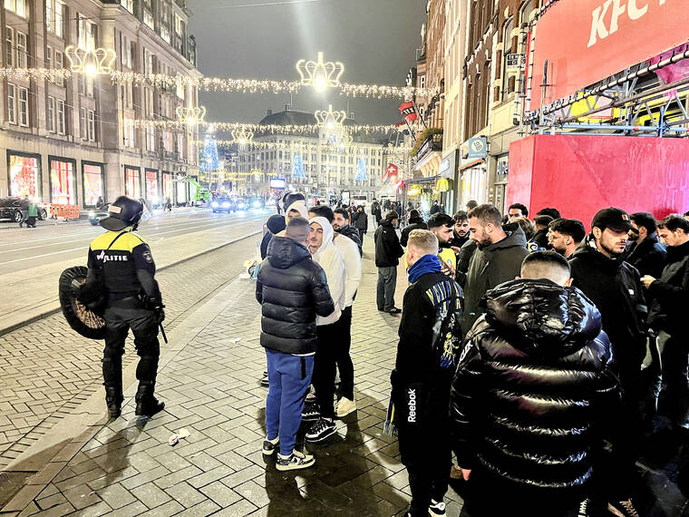 Videos circulating on social media and a video distributed by The Associated Press provided a glimpse of the tensions in the hours before the game. In the AP clip, dozens of men wearing scarves with the colors of Maccabi are seen gathering on Thursday at Amsterdam’s central Dam Square, where flares are being lit amid a heavy police presence.
