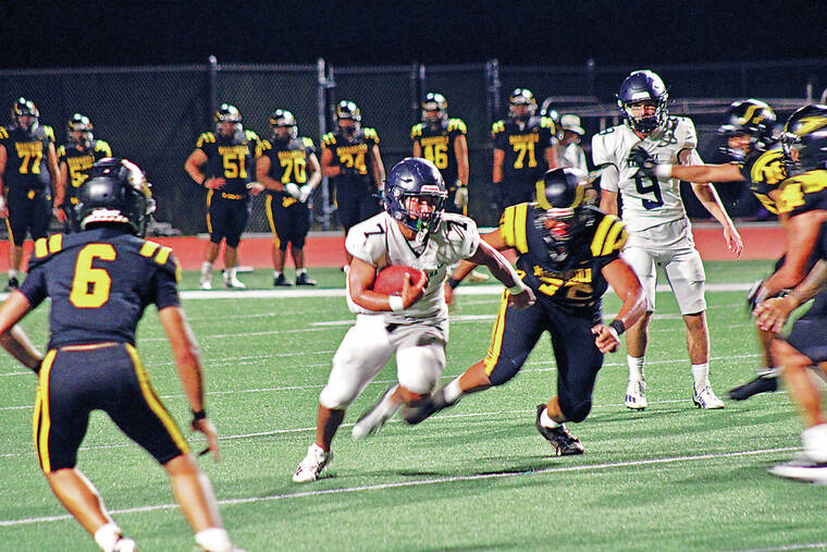 KSH running back Xander Hoopai rushes for gain against Nanakuli in an Aug. 10 non-conference game in Kea‘au. Hoopai and the Warriors will face Roosevelt in the HHSAA playoffs this weekend on O‘ahu. (Conor Langs/West Hawaii Today)