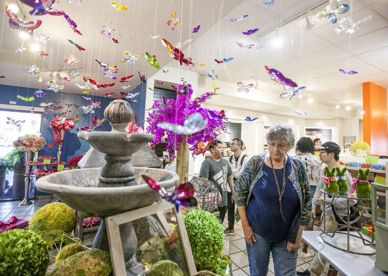In this 2019 file photo, visitors walk through a display of crystal butterflies and chocolates at Big Island Candies in Hilo. The number of visitors statewide in this past October nearly reached the total from October 2019 prior to the COVID-19 pandemic.