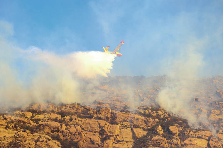 Burned homes smoldered on Tuesday as aircraft dropped water on burning vegetation.