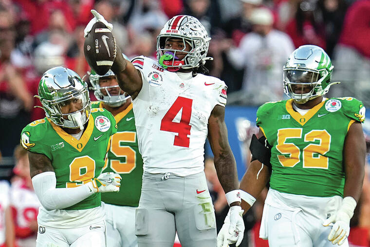 Ohio State freshman receiver Jeremiah Smith set the tone for the Buckeyes on the third play of the game. On second-and-10, he took a pass in the backfield off a motion, cut up field, made the Ducks’ safeties miss as they dove at his ankles and walked into the end zone for a 45-yard touchdown.