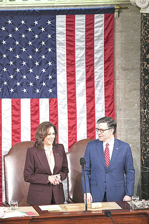On the dais in front of the House chamber, Harris made polite small talk with House Speaker Mike Johnson, who four years ago played a leading role in trying to overturn the results of the 2020 election.