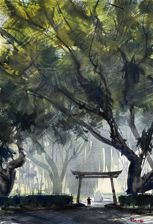 Watercolorist Ron Louie took first place Saturday in the 5th Banyan Drive Art Stroll art exhibit with his misty view of a torii titled “Grand Entrance.” Louie will receive a gift certificate from Hilo Hawaiian Hotel.