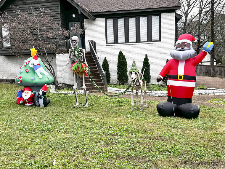 Before Election Day in early November, for example, the two skeletons — an 8-foot man and his supersize dog — supported Kamala Harris’ presidential bid with campaign flags. A few weeks later, Luttrell shifted toward Christmas by outfitting the man in a red-and-green tutu and by supplying the dog with a hat shaped like a Christmas tree.