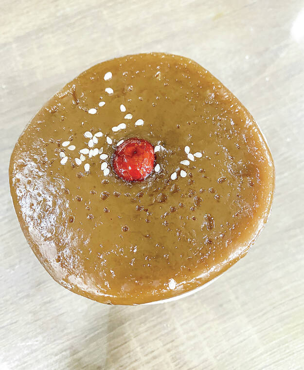 Nien gao or sticky rice pudding is very traditional. The sesame seeds on top symbolizes children and the red from the red dates means good luck. The stickiness from the sweet rice flour or mochiko symbolizes the family staying together.
