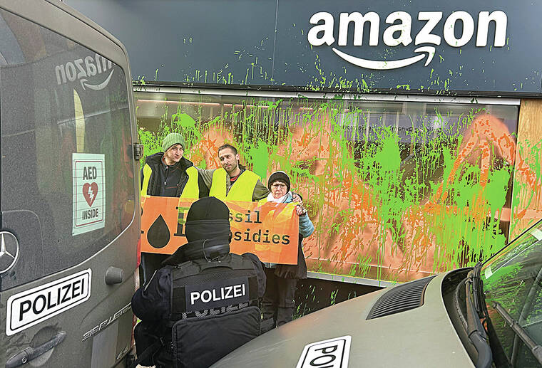 DAVOS, Switzerland — Climate activists sprayed green paint over Amazon’s base in Davos on Monday and disrupted helicopter landings at the start of the World Economic Forum’s annual meeting.