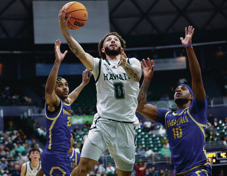 JAMM AQUINO / JAQUINO@STARADVERTISER.COM Hawaii guard Kody Williams (0) drives to the basket over Cal State Bakersfield guard Marvin McGhee IV (4) and guard Kadar Waller (12) during the first half of a men’s NCAA basketball game on Saturday at SimpliFi Arena at Stan Sheriff Center in Honolulu.