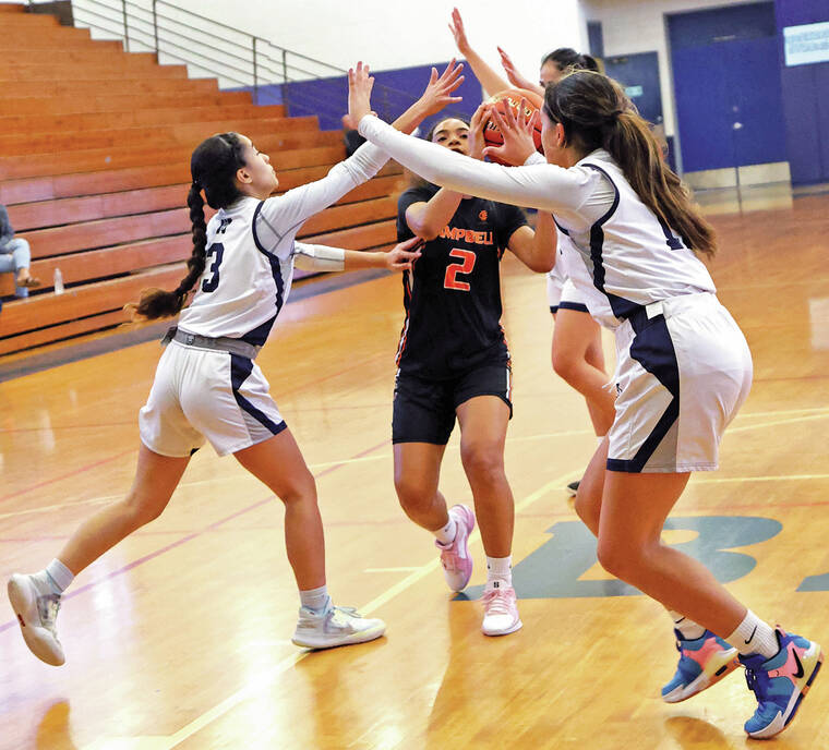During Monday's HHSAA state playoff game at Waiakea Gym, Campbell's Aiesha Deweever was cornered by Lady Warriors Maya Texeira (left), Charlie Brown, and Bryla Carenio (back). Campbell secured a 53-28 victory over Waiakea. (Tim Wright/Special to West Hawaii Today and Hawaii Tribune-Herald)