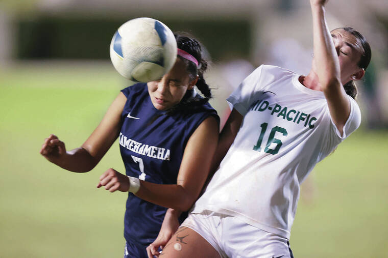KSH's Madisyn Meyers (7) scores the match-winning goal via a header in front of Mid-Pacific’s Destiny Look (16) during the second half of the HHSAA Division II Girls Soccer Championship on Monday at Waipio Soccer Stadium in Waipahu. (Andrew Lee/Special to the Star-Advertiser)