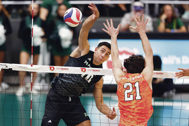 2025 January 15 SPT - Honolulu Star-Adverttiser photo by George F. Lee / GLEE@STARADVERTISER.COM Hawaii Warriors Kristian Titriyski took his swing against Princeton Tigers Mason Rice during a men’s NCAA volleyball match on Wednesday, Jan. 15, at the SimpliFi Arena, Stan Sheriff Center.