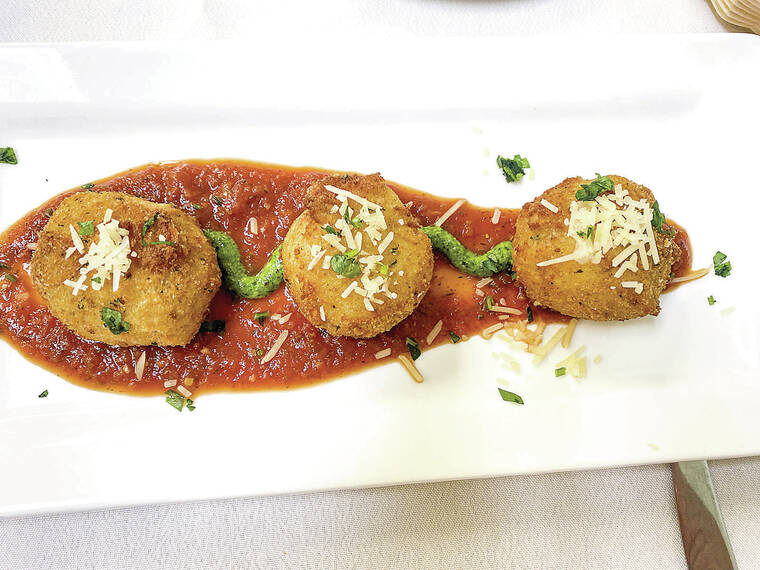 Antipasto or appetizers included Stuffed Mushrooms — mushroom caps filled with a delightful blend of breadcrumbs, chopped mushroom stems, garlic, parsley, lemon and Parmesan, and baked until tender and Arancini, fried Italian golden crisp rice ball served with a sauce.