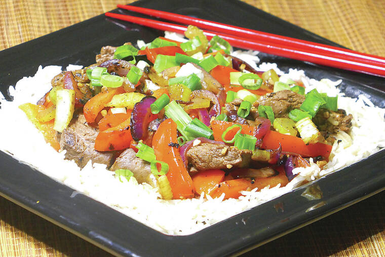 To buy: 3/4 pound grass-fed beef tenderloin or strip steak, 1 bottle reduced sodium soy sauce, 1 container minced garlic, 1 bottle balsamic vinegar, 1 jar Aji Amarillo paste, 1 package microwaveable Jasmin rice, 1 red onion, 1 red bell pepper, 1 bunch celery and 1 bunch scallions.