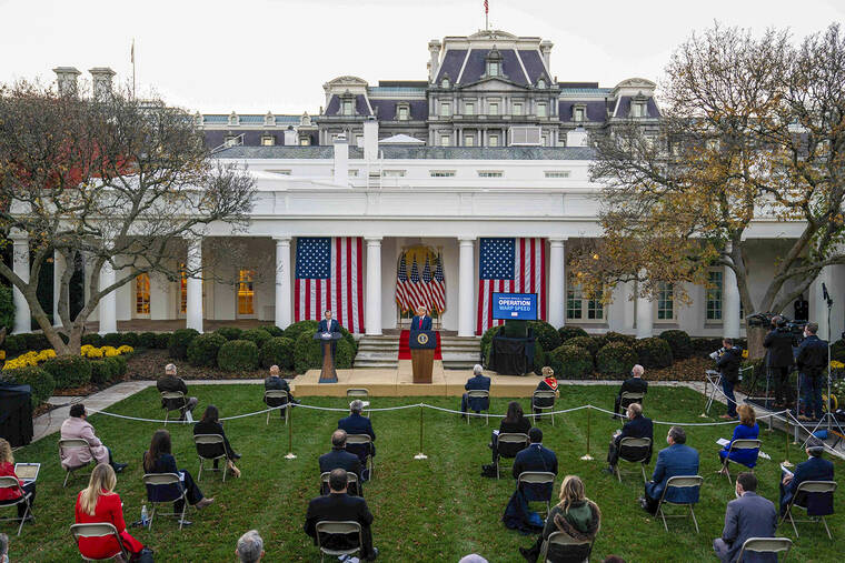 FILE — During President Donald Trump’s first term, he and Alex Azar, health and human services secretary, speak in the Rose Garden at a news conference during the COVID-19 pandemic, at the White House in Washington, Nov. 13, 2020. Trump has told associates that he wants to rip up the grass in the Rose Garden and replace it with a hard surface to resemble a patio like one he has at Mar-a-Lago. (Anna Moneymaker/The New York Times)