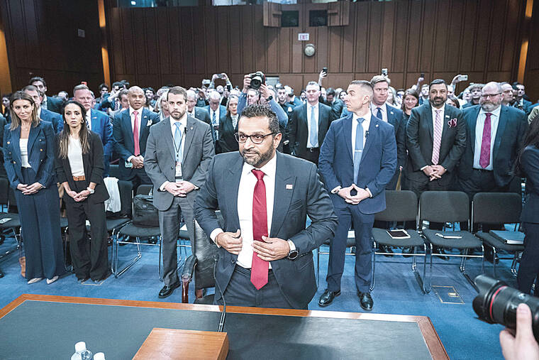 At Patel’s confirmation hearing last month, Democratic senators pressed him about incendiary comments he had directed at the FBI, including a so-called enemies list published at the end of his book, “Government Gangsters.” Patel disputes that description, calling it “a total mischaracterization.”