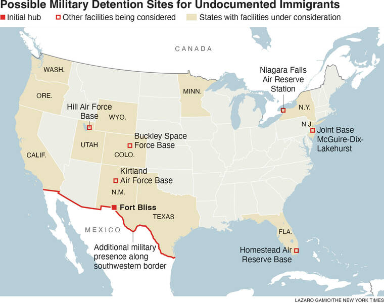 Fort Bliss would serve as a model as the administration aims to develop more detention facilities on military sites across the country — from Utah to the area near Niagara Falls — to hold potentially thousands more people and make up for a shortfall of space at Immigration and Customs Enforcement facilities, the officials said. They spoke on the condition of anonymity to discuss details of a plan that is still in its early stages and has not yet been finalized.