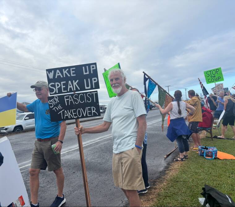 “I’m hoping that there is some way that we can do something, and that more people will speak up,” said Francis Dauw, who held a large sign that read, “WAKE UP, SPEAK UP, STOP THE FASCIST TAKEOVER.” “Fortunately, our own congresspeople (representing Hawaii) are in support of what we’re doing, but there are a lot of people who are not, and I’m hoping the Republican Party can get a life.”