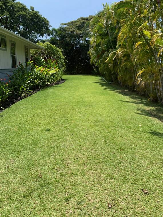 Foundation plants by the house with a low-maintenance Zoysia lawn, shade trees and Areca palms as a screening between neighbors make a tropical garden lush and private to be enjoyed. When each home gardener in a neighborhood like Kahakai Estates makes this kind of effort, it creates an urban forest that all can enjoy. Photo courtesy of Voltaire Moise.