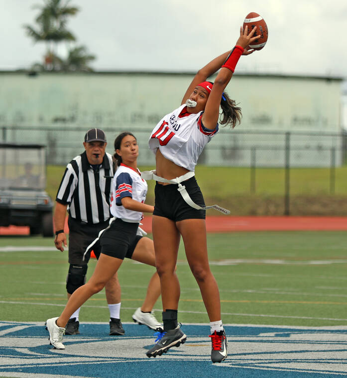 Kea‘au's Kay Bergau makes a fingertip catch on a high pass against Kamehameha during Wednesday's BIIF flag football game hosted by the Lady Warriors. (Tim Wright/Special to West Hawaii Today and Hawaii Tribune-Herald)