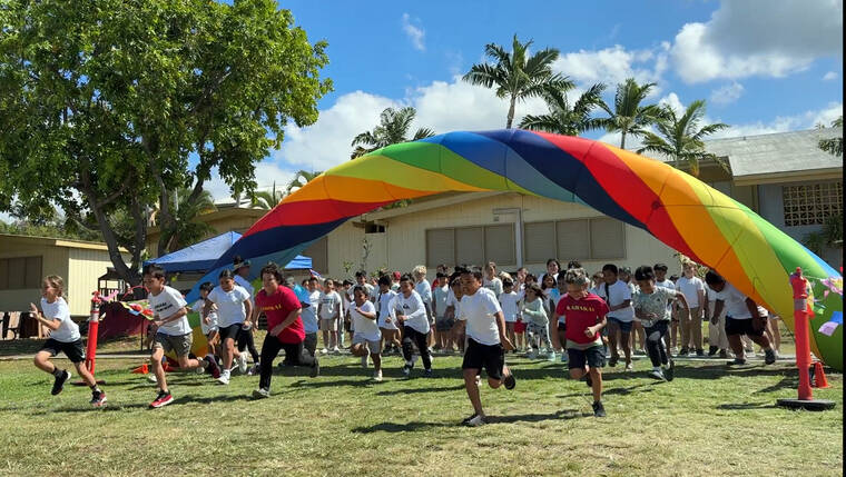 On Monday, Kahakai’s campus burst to life with a rainbow of colors as nearly 500 students — from preschool through fifth grade — laced up their shoes and donned white T-shirts for the 11th annual Rainbow Run.