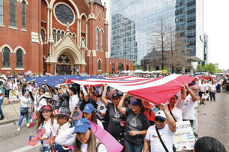 Organized by The League of United Latin American Citizens, demonstrators began at the National Shrine Cathedral of Our Lady of Guadalupe and marched to the sounds of Ray Charles’s rendition of “America the Beautiful.” Participants made their way down Ross Avenue at the start of the rally.
