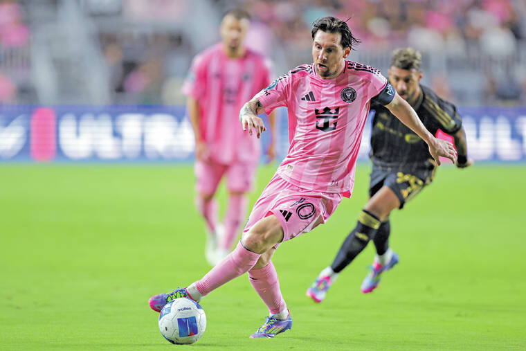 Inter Miami CF forward Lionel Messi (10) dribbles the ball against the Los Angeles FC during the second half of Wednesday's match in Ft. Lauderdale, Fla. (Sam Navarro/Imagn Images)